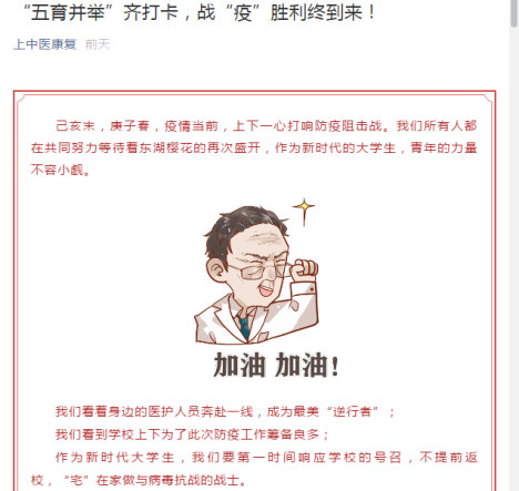 在中医理论中,“木”代表生机。在新型冠状病毒感染肺炎疫情的防控工作中,龙华临床医学院、曙光临床医学院、岳阳临床医学院、普陀临床医学院、市中医临床医学院等附属医院的辅导员充分利用医学技术优势,线上、线下结合,为留校学生宣讲疫情防控知识,赠送口罩等防疫用品。公共健康学院辅导员向学生多维度讲述人与自然要和谐相处,自觉保护野生动物,尊重生命。基础医学院辅导员通过青年班主任线上教学八段锦,以增强学生体质,努力做到关爱学生不断线,师生互动不断线,在落细、落小、落实上下功夫,在关爱学生上出硬招、出实招、出新招。