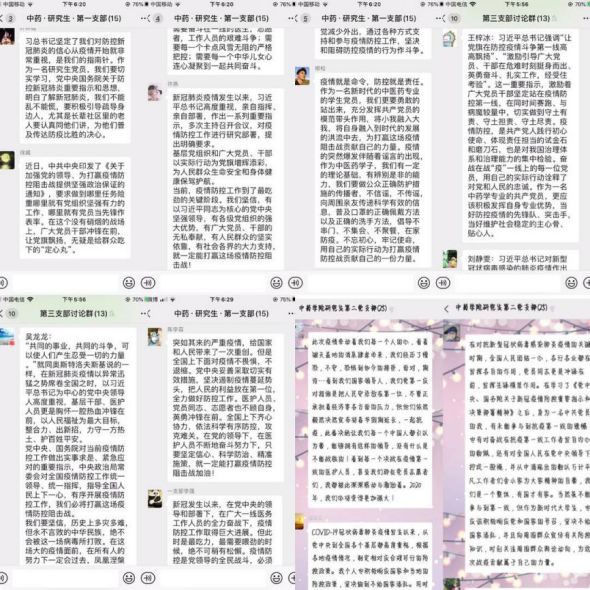 当前,新型冠状病毒感染肺炎疫情的防控工作正处在关键时期,研究生党总支积极打造网络学习平台,通过不定期开展线上组织生活,主动学习党中央、市委和学校党委重大决策部署,形成抗击疫情的强大思想和行动共识,为贯彻落实各项要求、打赢疫情防控阻击战提供坚强的政治保证。药学专业的党员们表达了努力钻研祖国药学、充分发挥中医药优势的坚定信念和决心,以及为实现健康中国作出中药人贡献的奋斗目标。