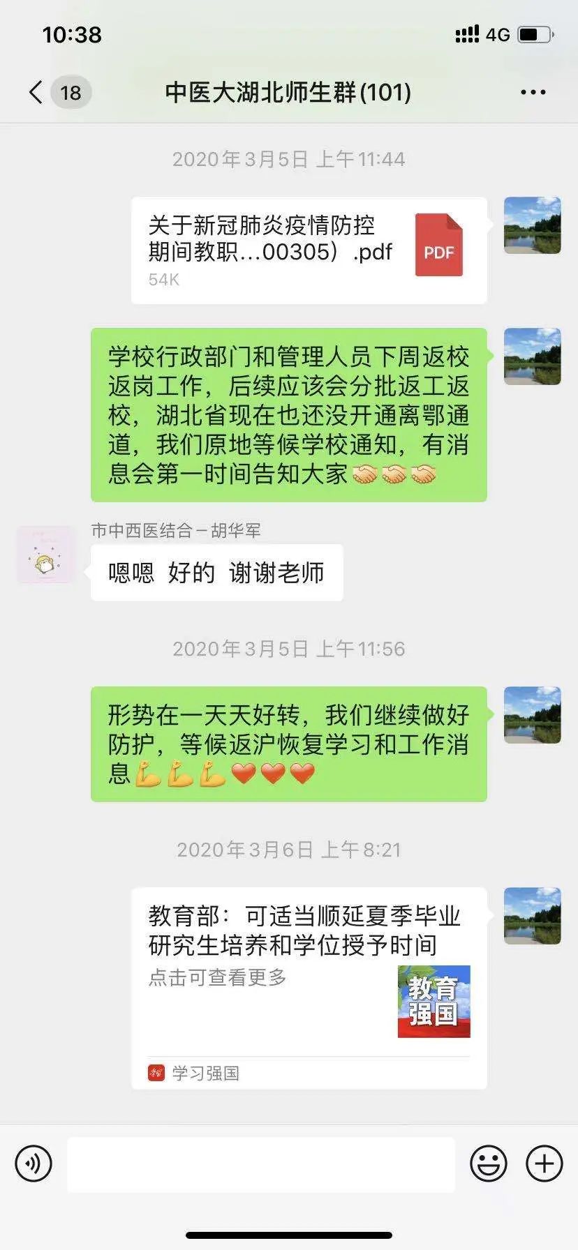 疫情发生以来,各学院(单位)党政领导、研究生导师、导师团导师、辅导员、青年班主任积极主动与在鄂学生联系,协调解决了他们急切关心的学业问题,同时开展网上座谈会,停课不停教,时刻关心着他们和家人的安全。