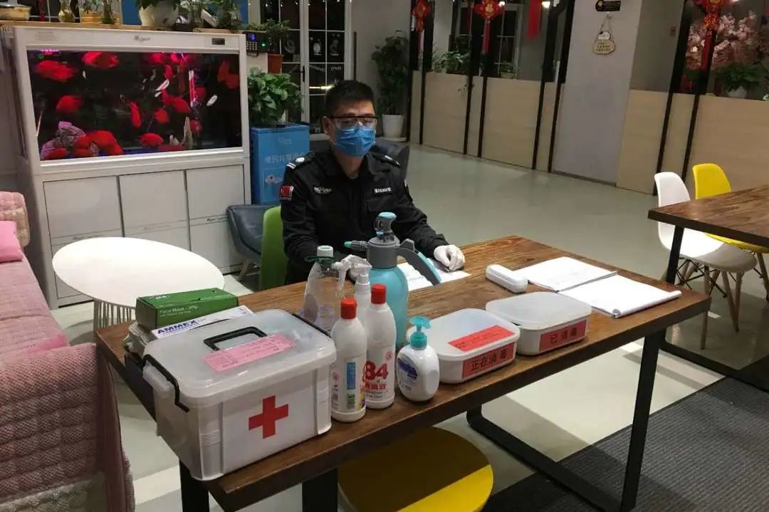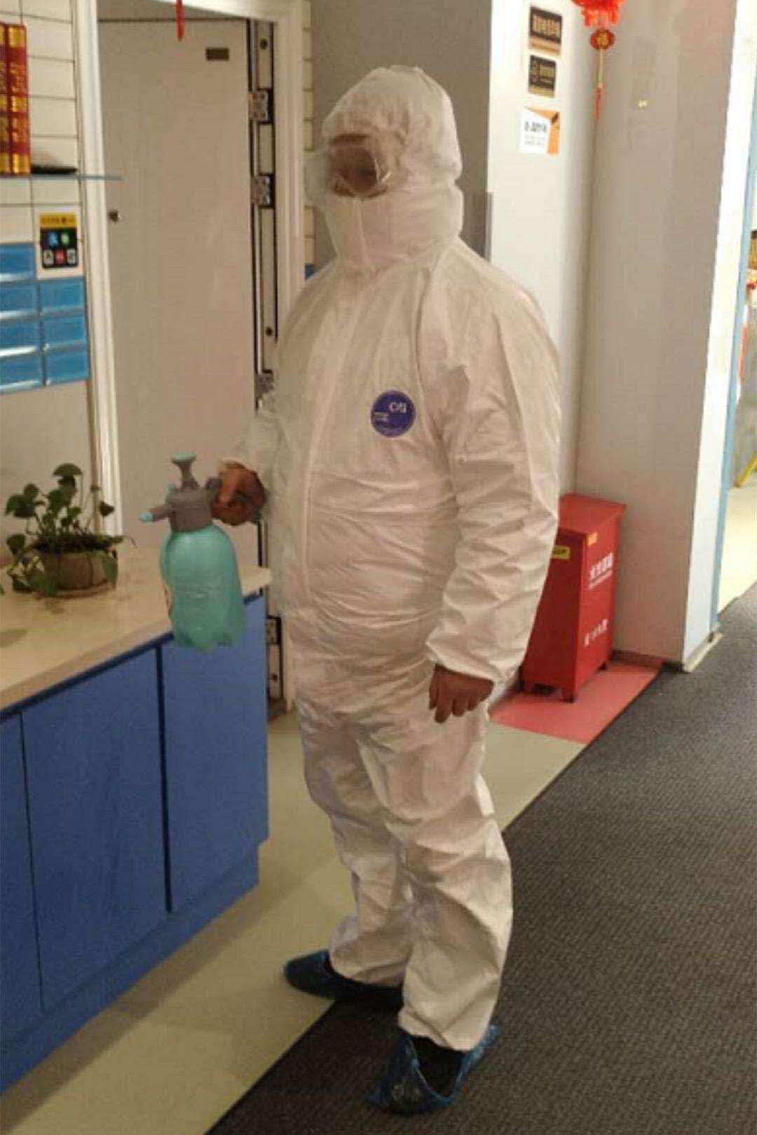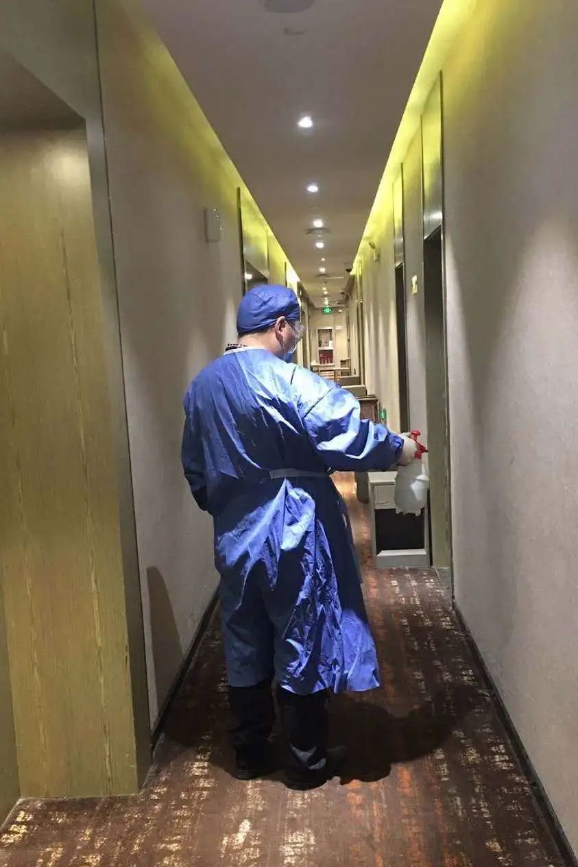 他们是24小时保洁人员。丁军民说:“1月28日那天,几十间房间进行调整,消毒、整理,我们公寓和酒店几个保洁人员整整忙到晚上11点。”保洁人员经常要背上几公斤重的消毒水,为每个区域消毒,穿着厚厚的隔离服常常一次消毒完成就是一身汗,但是大家都毫无怨言。