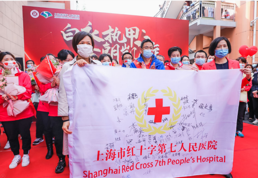 仪式上,医院向高桥镇和浦东新区红十字会分别赠送了由医院全部54名援鄂队员亲笔签名的队旗和红十字会旗。