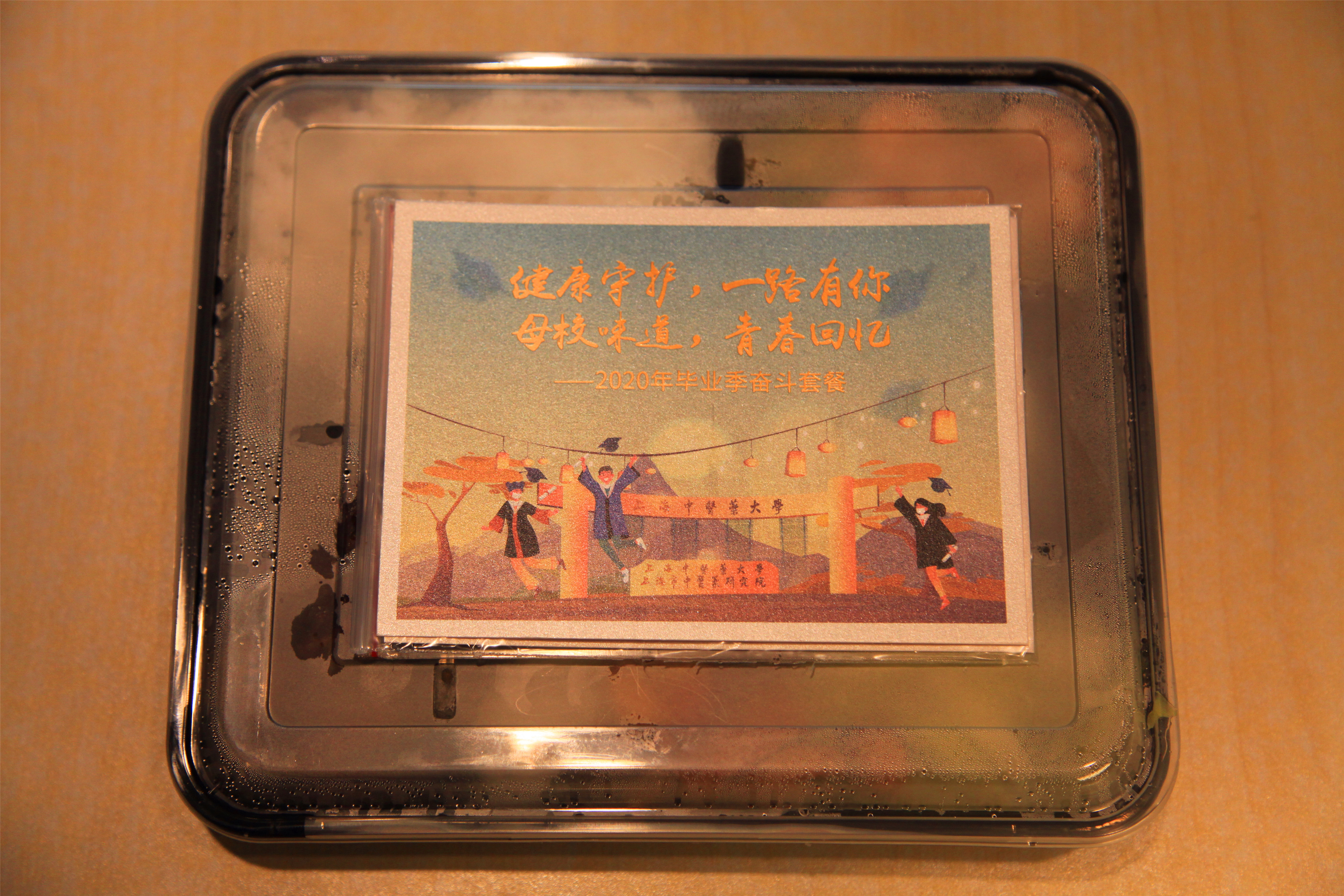 食堂大厨精心烹制毕业季奋斗套餐,餐盒贴上印着欢快的毕业场景和“健康守护,一路有你;母校味道,青春回忆”。这不仅是一张餐盒贴,更是一张明信片,可以用来私人珍藏,可以寄给远方亲友,也可以寄给未来的自己,希望这份特别的毕业纪念礼能带给你难忘的“青春回忆”。