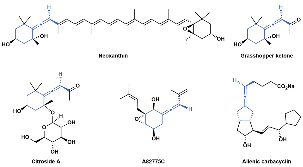据统计,150种以上天然产物包括中药活性分子存在手性环外联烯结构,比如新叶黄素(Neoxanthin)、蚱蜢酮(Grasshopper ketone)、柑橘苷A(Citroside A)等。由于其独特的结构及重要的生物活性,得到了学术界广泛的关注。但是,该结构的立体专一性合成一直备受化学界的困扰,近年来鲜有报道。