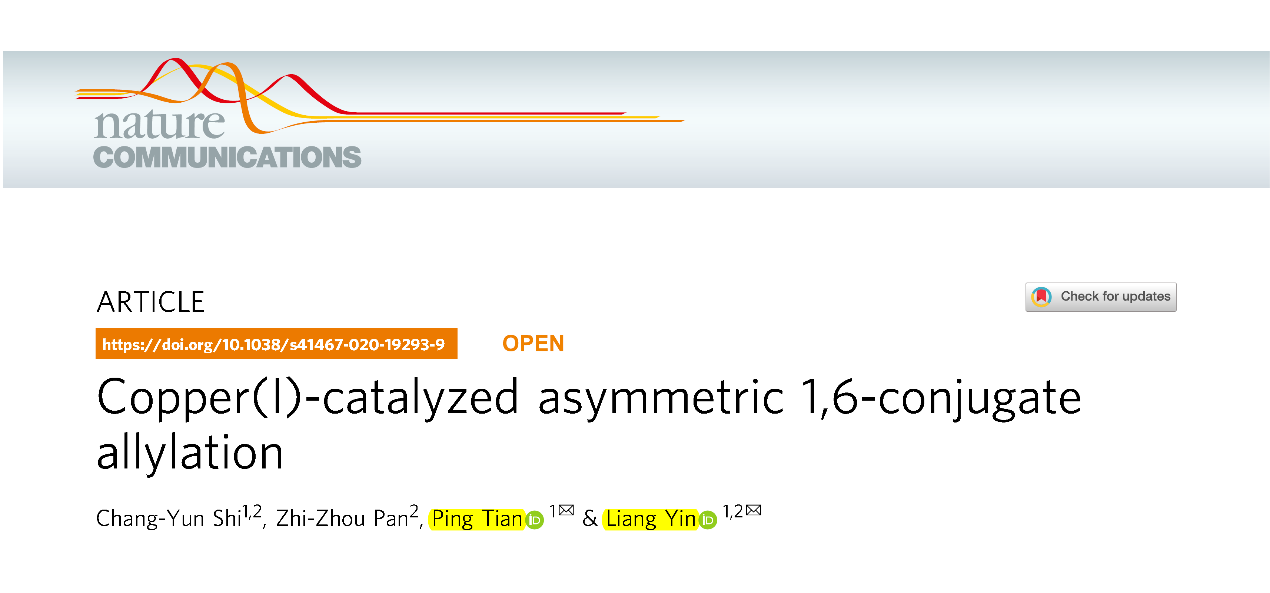 近日,BEAT365创新中药研究院林国强院士团队田平课题组和中国科学院上海有机化学研究所殷亮课题组联合研究团队在《自然通讯》(Nature Communications)上发表研究论文Copper(I)-catalyzed asymmetric 1,6-conjugate allylation,采用金属铜和手性卡宾配体成功实现了催化的不对称1,6-烯丙基共轭加成反应。