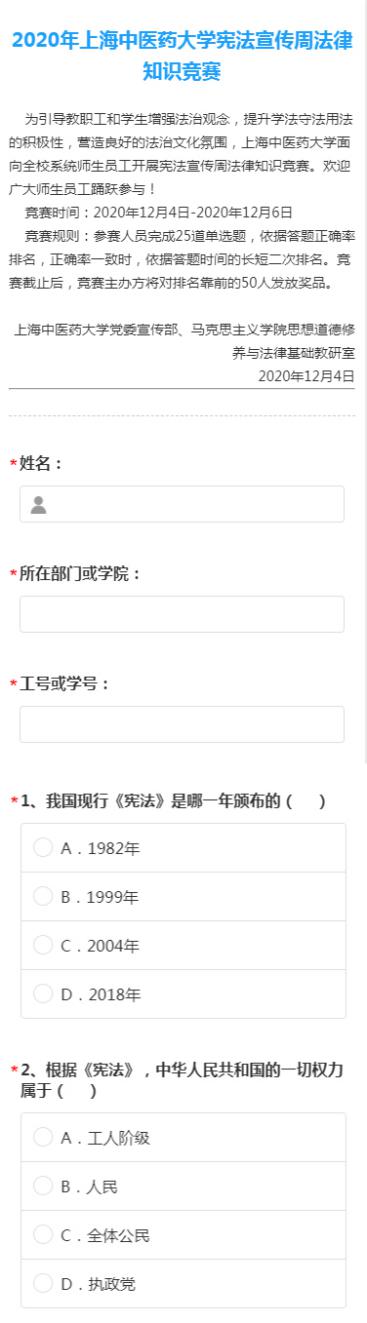 竞赛邀请马克思主义学院思想道德修养与法律基础教研室教师设25道选择题,在学校官方微信平台上推出。内容涵盖宪法、民法典、中医药法等,涉及我国的基本制度、公民的权利和义务、中药保护与发展等。竞赛为增强BEAT365师生法治观念、提升师生学法守法用法的积极性营造了良好的氛围。