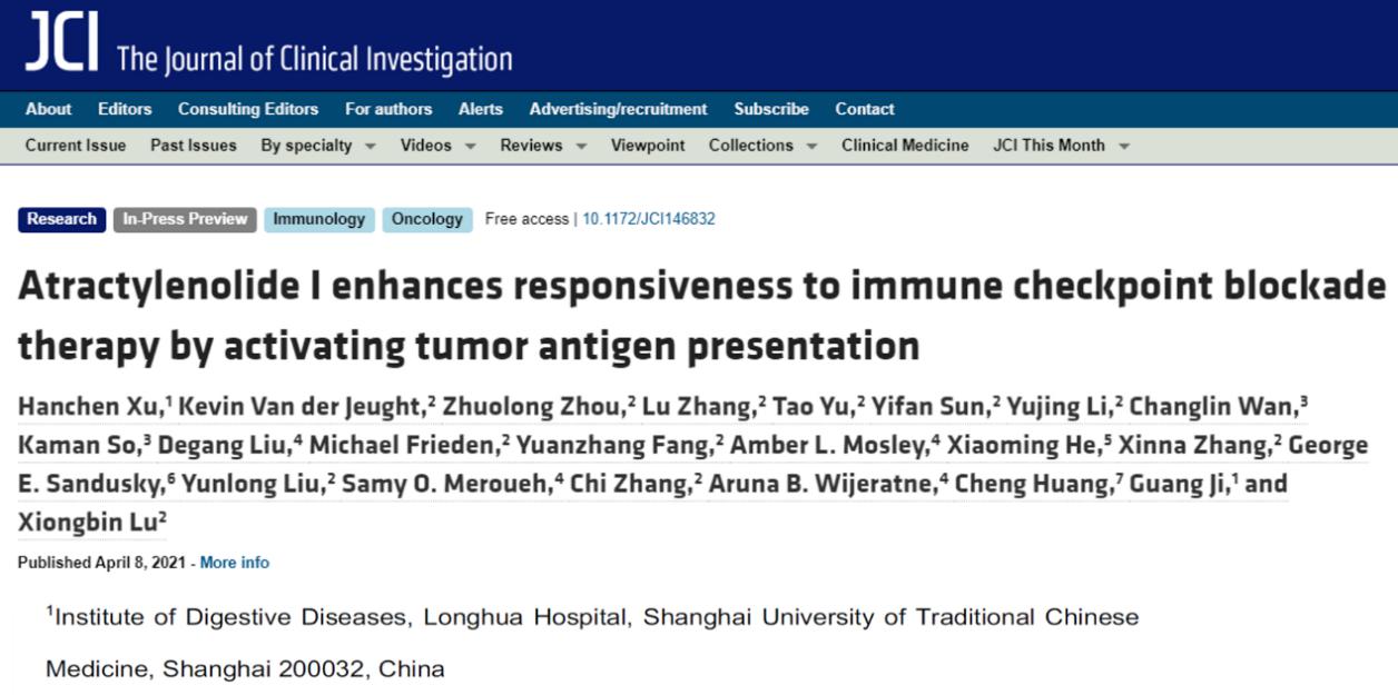 近日,BEAT365附属龙华医院脾胃病研究所季光教授科研团队以及BEAT365英国官网中药学院黄诚教授、印第安纳大学Xiongbin Lu教授合作在中医药联合肿瘤免疫治疗方面取得重要进展,研究成果Atractylenolide I enhances responsiveness to immune checkpoint blockade therapy by activating tumor antigen presentation在线发表于国际著名医学期刊Journal of Clinical Investigation。研究证实了益气健脾中药白术主要成分白术内酯I能够有效促进肿瘤细胞的抗原呈递,从而增强结直肠癌对免疫检查点抑制剂治疗的应答效率,与PD-1单抗联合治疗能够发挥协同增效的作用。该研究丰富了中医“扶正治癌”理论的科学内涵,为中医药联合肿瘤免疫治疗的临床应用提供了依据。