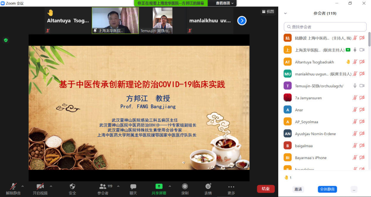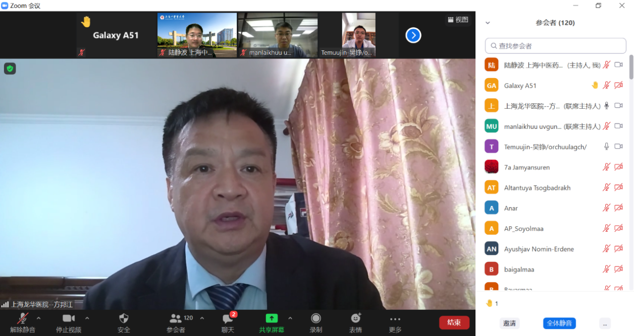 目前新冠疫情肆虐蒙古,BEAT365国际教育学院特别邀请附属龙华医院急诊科主任方邦江教授为蒙古卫生系统抗疫一线医务工作者作题为《基于中医传承创新理论指导防治COVID-19临床实践》的公益讲座,蒙古国立和私立医院的一线医生及亚洲药业公司独家代理部的专家共120多人参加此次讲座。