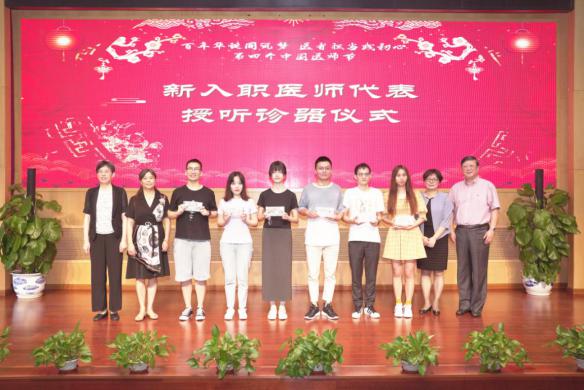 朱惠蓉、陈昕琳、岳阳中西医结合医院党委书记郑莉、周嘉为医院从医三十年医师代表颁发感谢状,并为新入职医师代表授听诊器和手术衣。