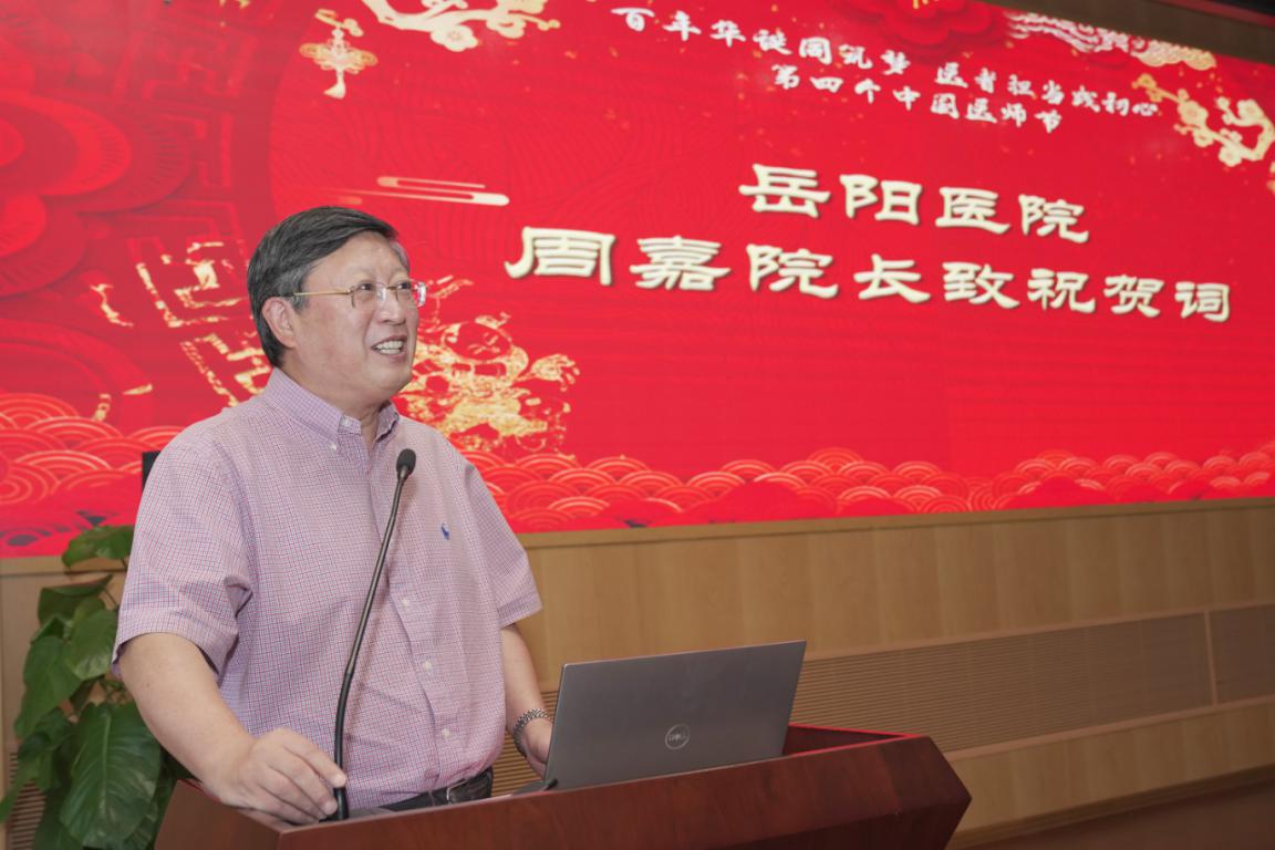 岳阳中西医结合医院院长周嘉向全院医务人员致以节日问候,并对过去一年中大家的辛勤付出表示充分肯定和由衷感谢。他希望在新的历史起点上,全体医务工作者以健康中国建设为目标,牢记“精、勤、仁、信”的院训,传承高尚医德,构筑和谐医患,为“健康中国2030”的强国之梦努力奋斗。