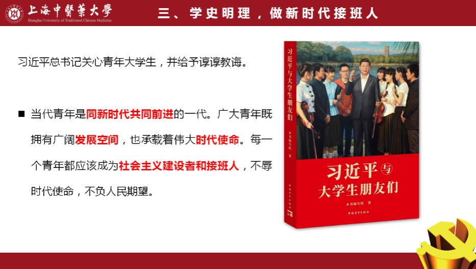 段艳霞以“学史明理,做新时代接班人”为切入点,指出“当代青年是同新时代共同前进的一代。广大青年既拥有广阔发展空间,也承载着伟大时代使命。每一个青年都应该成为社会主义建设者和接班人,不辱时代使命,不负人民期望。”