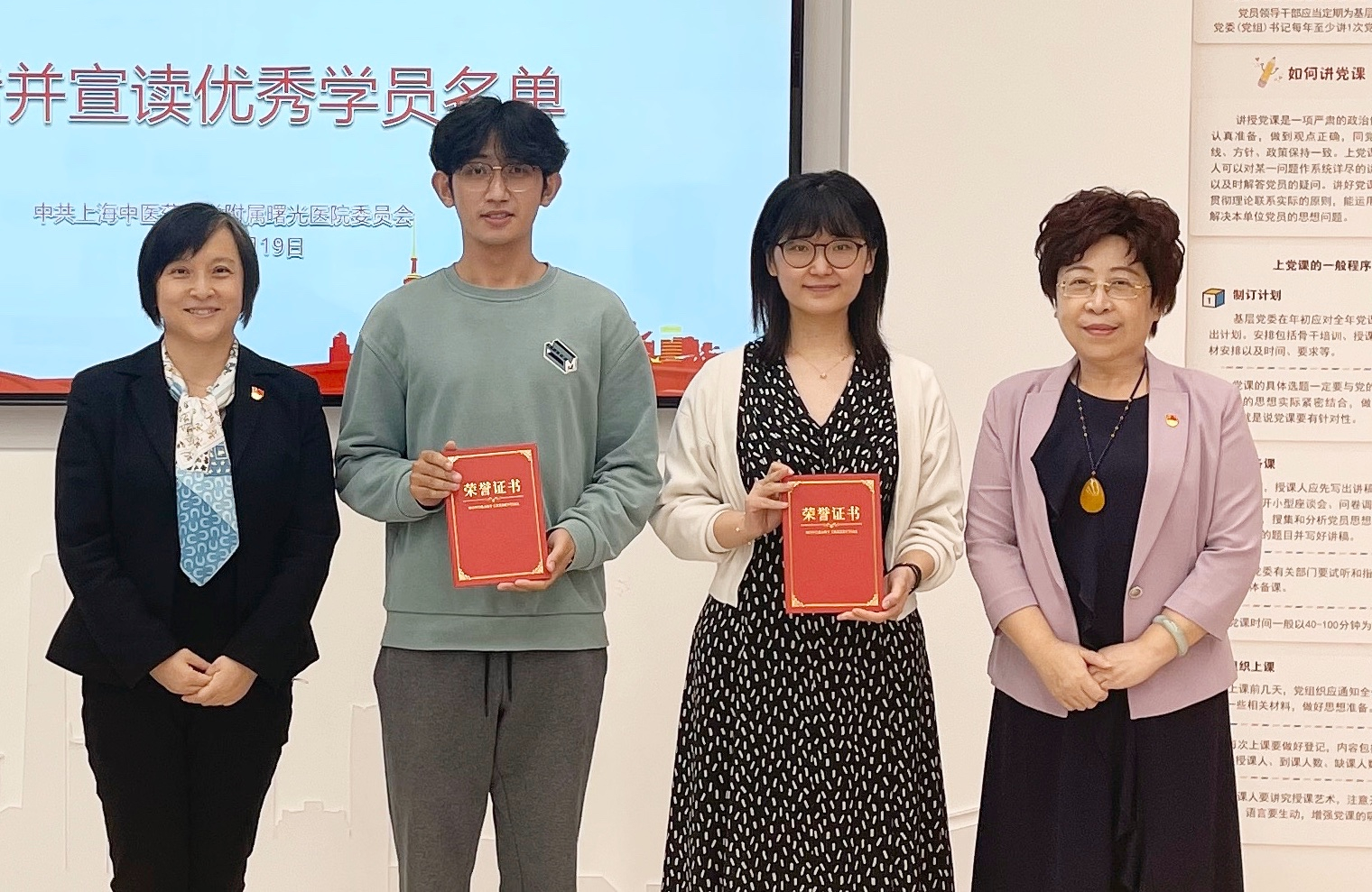 医院党委领导为优秀学员姚家慧、孟愿颁发荣誉证书。两位优秀学员分别交流了学习体会。