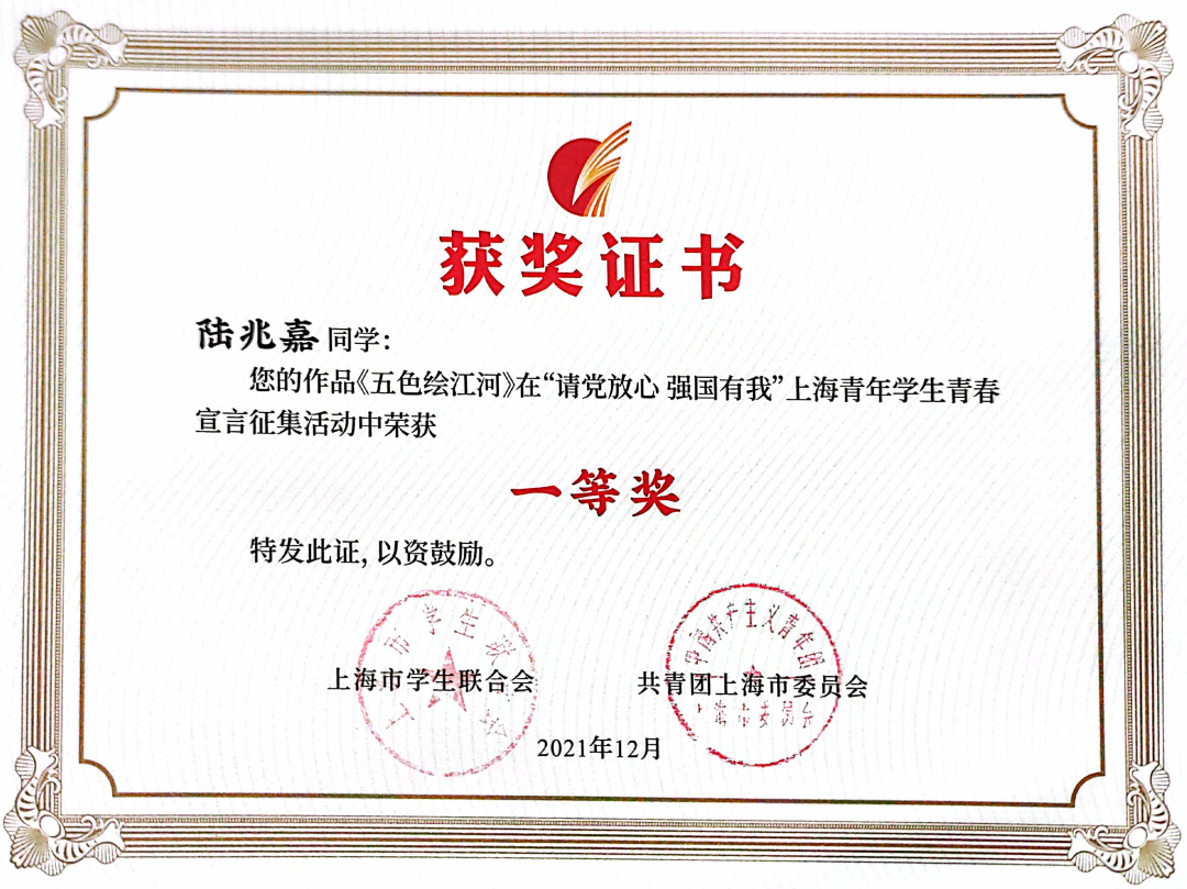 近日,上海市学生联合会第十七次代表大会落幕,BEAT365学生在“请党放心 强国有我”上海青年学生青春宣言征集活动中获佳绩。BEAT365研究生陆兆嘉参赛作品《五色绘山河》、本科生马美琳参赛作品《知行中国,红色百年》分获高校组一等奖和高校组二等奖。