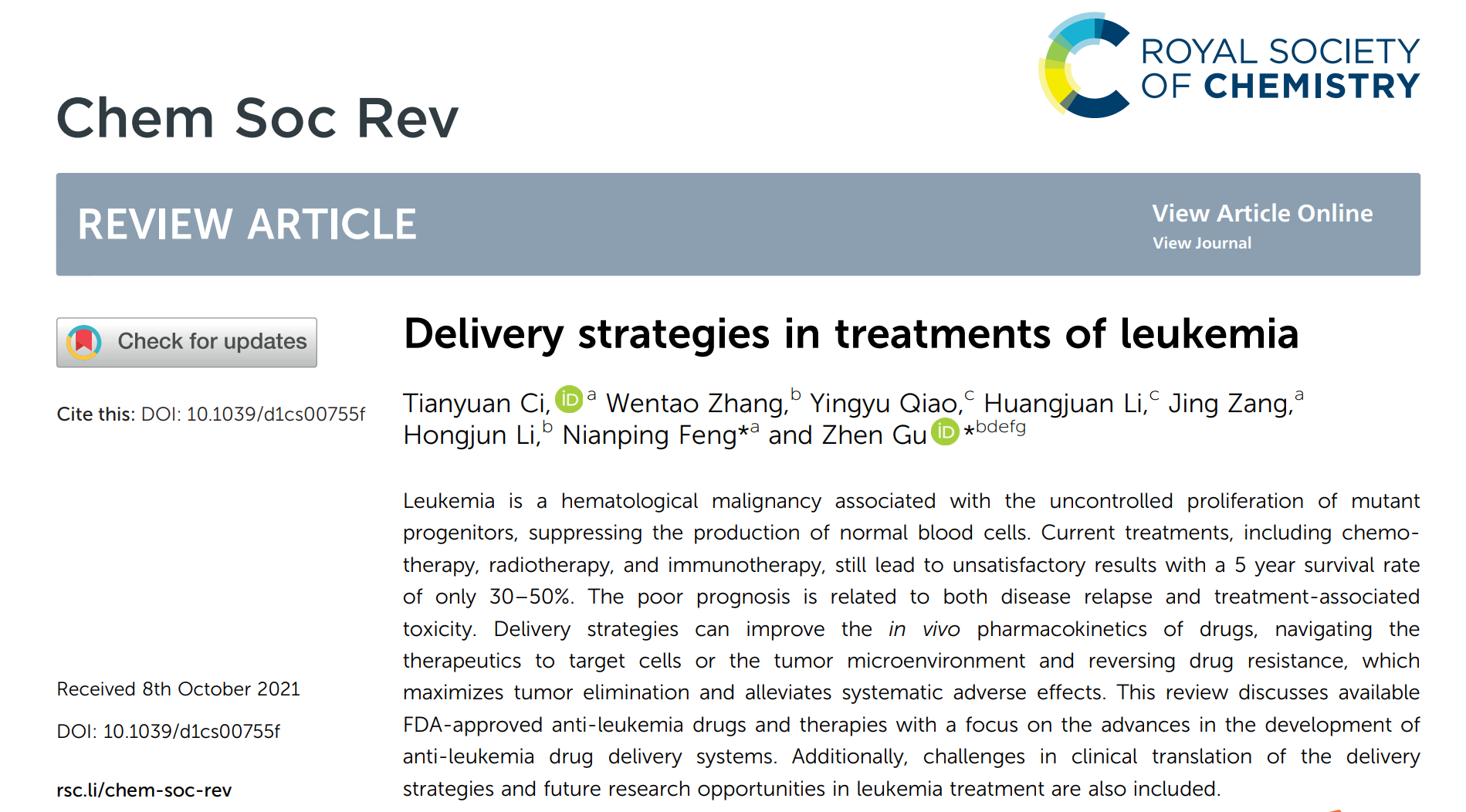 近日,BEAT365中药学院慈天元、冯年平团队在国际化学顶级综述期刊Chemical Society Reviews上发表针对白血病治疗的递药系统及最新进展的综述文章Delivery strategies in treatments of leukemia。BEAT365中药学院副教授慈天元为论文第一作者,浙江大学教授顾臻与BEAT365中药学院冯年平教授为论文共同通讯作者,BEAT365为论文第一完成单位。