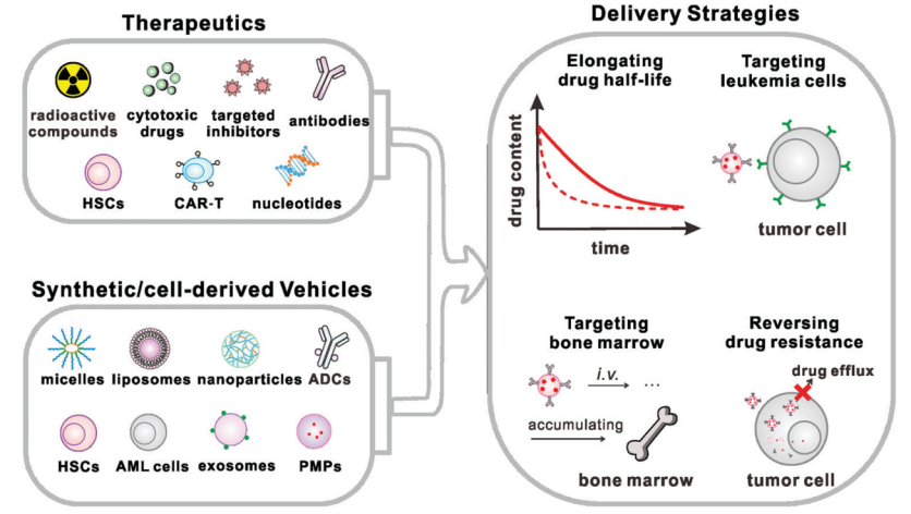 临床上用于治疗白血病的药物大多存在脱靶、耐药和不同程度的毒副作用,因此迫切需要改善药物体内性能的新策略。药物递送系统可以改善药物在体内的药动学参数,实现药物对肿瘤细胞或肿瘤微环境的靶向治疗并逆转耐药,从而最大限度地消除肿瘤细胞、减轻药物不良反应。该综述重点论述了抗白血病中西医药物给药系统的研究进展,并对药物递送策略在临床转化方面所面临的挑战、中西医结合药物治疗的潜力和个体化治疗的发展前景进行分析讨论。