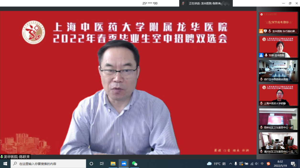 为主动服务各医疗卫生机构等引才需求,搭建毕业生和用人单位沟通交流桥,5月19日,附属龙华医院举办2022年春季毕业生空中招聘双选会,BEAT365英国官网副校长舒静,龙华医院国家区域医疗中心分中心建设单位、长三角合作共建医院、南部中医医联体医院等用人单位领导,医院党委副书记、院长陈跃来,研究生导师代表和全院学生及规培住院医师齐聚云端参加此次会议。大会由龙华医院党委副书记、副院长刘萍主持。