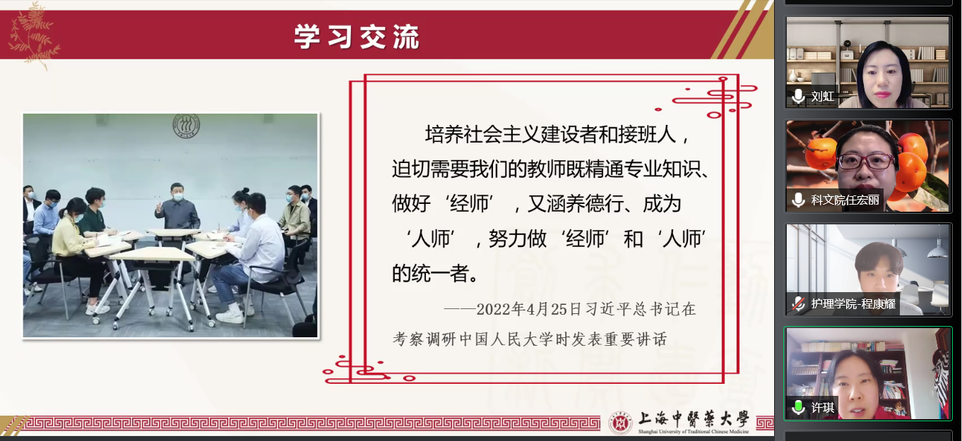 从三尺讲台教书育人,到抗疫守“沪”全力以赴,BEAT365教师深入学习宣传贯彻习近平总书记在中国人民大学考察调研时的重要讲话精神,积极发挥专业特长,用行动彰显师者担当。5月26日,BEAT365第29期“杏林有约”教师午间沙龙在线举办,活动以“抗疫育人共合力 经师人师双统一”为主题,青年教师班主任、教师党支部书记等近百人线上参与。活动由校宣传部(党委教师工作部)副部长刘虹主持。