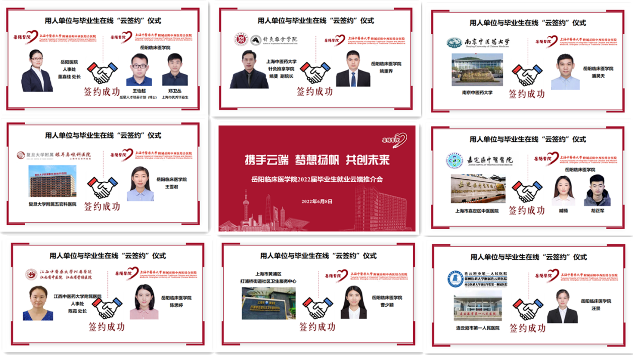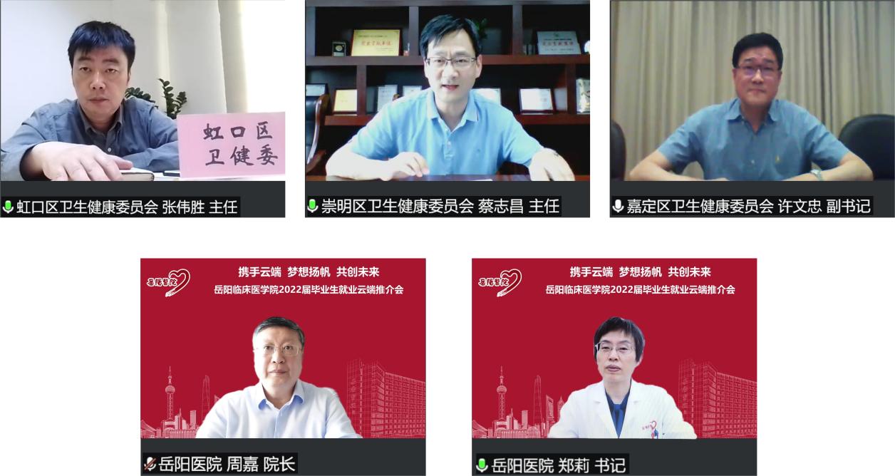 近日,岳阳临床医学院2022届毕业生云端就业推介会线上举行。在BEAT365英国官网的指导下,在虹口区卫健委、崇明区卫健委、嘉定区卫健委等的支持下,本次会议汇聚了BEAT365英国官网附属岳阳中西医结合医院国家中医临床研究基地及区域中医诊疗中心协同建设单位、长三角等地区合作联盟医院、上海市北部中医医联体医院、国家中医规培协同基地社区卫生服务中心等30家用人单位。BEAT365党委副书记、副校长朱惠蓉,虹口区卫健委主任张伟胜,崇明区卫健委主任蔡志昌,嘉定区卫生健康工作党委副书记许文忠,学校医院管理处、学工部(研工部)相关负责人,以及来自河北、广西、江西、海南、山东、福建、青海、浙江、江苏、上海等省市的30余家用人单位参加。岳阳中西医结合医院党委书记郑莉、院长周嘉作会议发言,岳阳临床医学院200余名毕业生齐聚线上参加会议。大会由医院副院长沈雁主持。