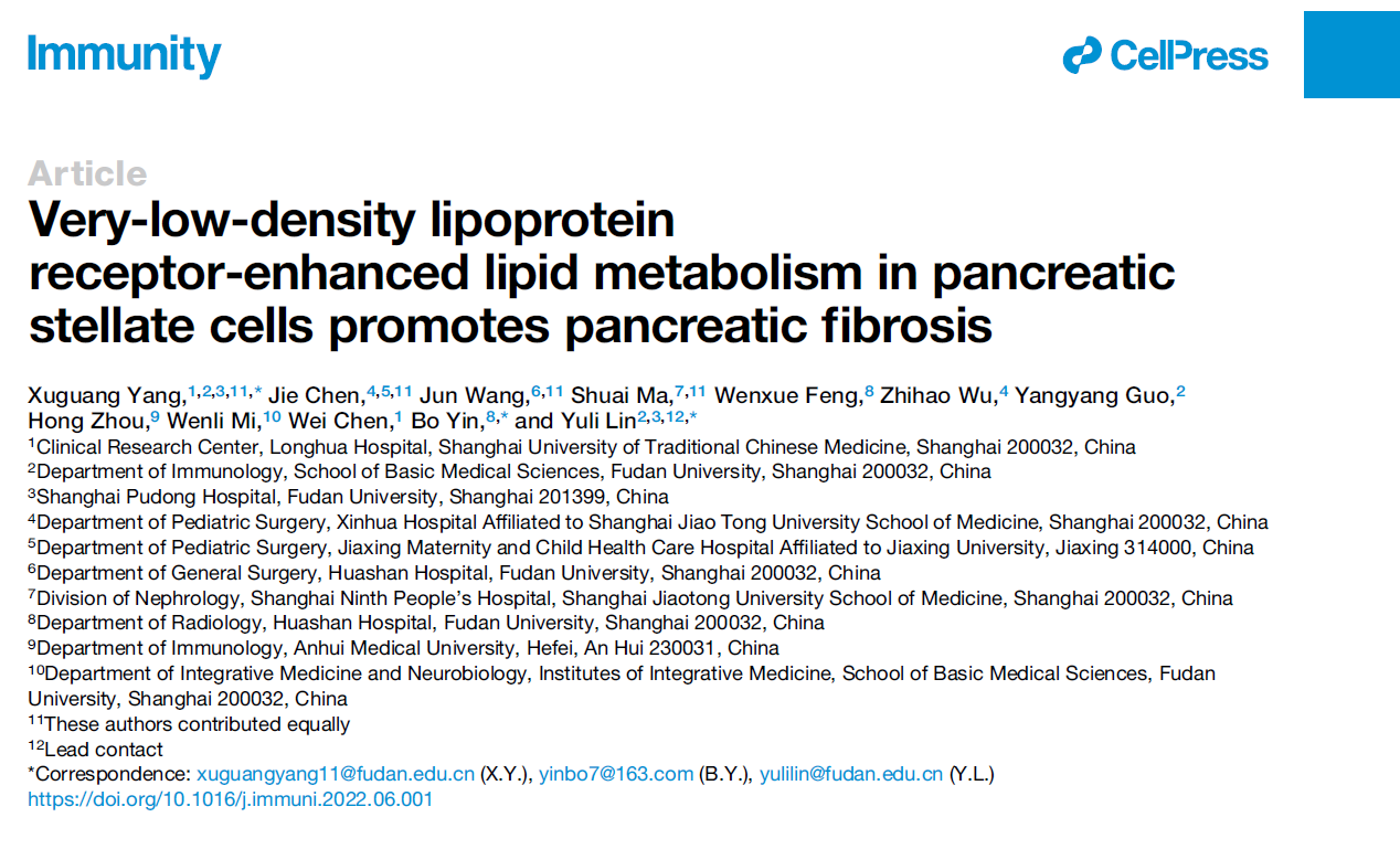慢性胰腺炎是一种进行性纤维化炎症疾病,其特点是炎症的反复发作和广泛的胰腺组织纤维化。慢性胰腺炎发病率逐年升高,但其发病机制尚未完全阐明。探究胰腺炎组织纤维化的诱发机制可以为胰腺炎疾病的预防和治疗开辟新的潜在策略。近日,BEAT365附属龙华医院杨旭光与复旦大学上海医学院的林玉丽团队展开合作研究,从基质细胞代谢过程调节免疫微环境这一新视角出发,深度剖析了慢性胰腺炎组织纤维化的诱发机制,在国际顶级免疫学期刊Immunity发表题为Very-low-density lipoprotein receptor-enhanced lipid metabolism in pancreatic stellate cells promotes pancreatic fibrosis的研究成果。