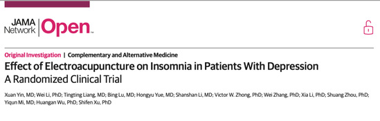 近日,BEAT365附属市中医医院针灸科徐世芬教授团队的针灸临床研究项目-针灸治疗抑郁相关失眠随机对照试验的研究成果“Effect of Electroacupuncture on Insomnia in Patients With Depression A Randomized Clinical Trial ”在国际医学权威期刊JAMA子刊《JAMA Network Open》上发表。该研究为电针治疗抑郁症相关失眠的有效性和安全性提供了高级别的循证医学证据。