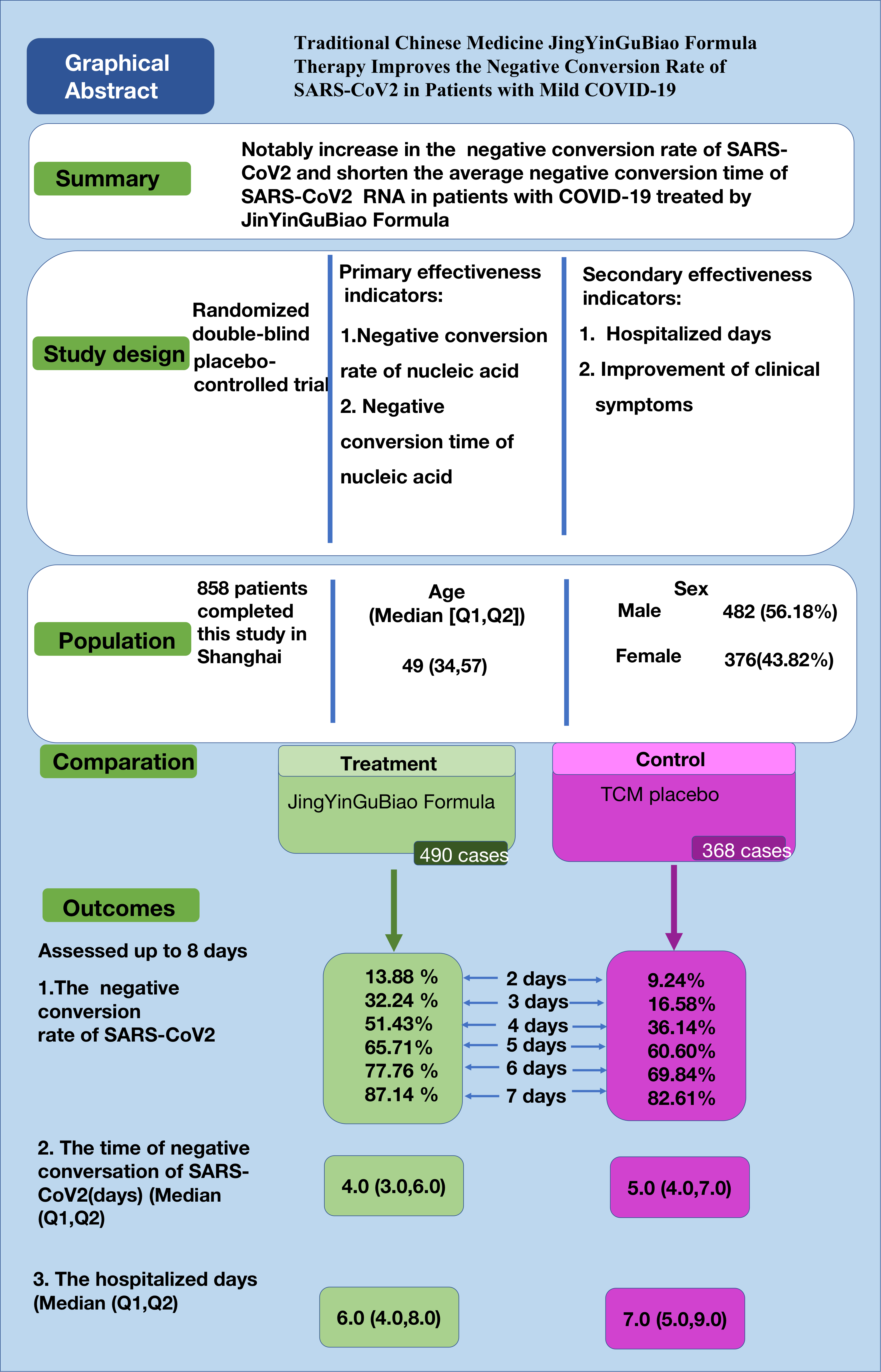 荆银固表方是国家中医药疫病防治基地(BEAT365英国官网附属曙光医院)联合上海市有关中医药专家制定的《上海市新型冠状病毒感染中医药诊疗专家共识(2022 春季版)》推荐的中药复方。该项研究旨在评价中药荆银固表方治疗轻型COVID-19感染者的安全性和有效性。今年4月8日至5月6日,885例患者随机分为荆银固表方组或中药安慰剂组,疗程7天,主要疗效指标是SARS-CoV2 RNA的转阴率和转阴时间,次要疗效指标是住院天数和症状改善情况。疗程结束,共858例患者完成疗效评价。