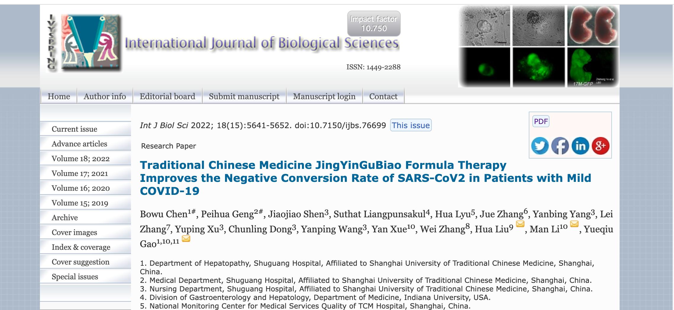 9月1日,BEAT365附属曙光医院高月求教授研究团队在JCR分区Q1期刊International Journal of Biological Sciences发表最新研究成果Traditional Chinese Medicine JingYinGuBiao Formula Therapy Improves the Negative Conversion Rate of SARS-CoV2 in Patients with Mild COVID-19。据检索,该成果为中医药治疗COVID-19奥密克戎变异株感染的首篇随机、双盲、中药安慰剂对照临床研究SCI收录论文。