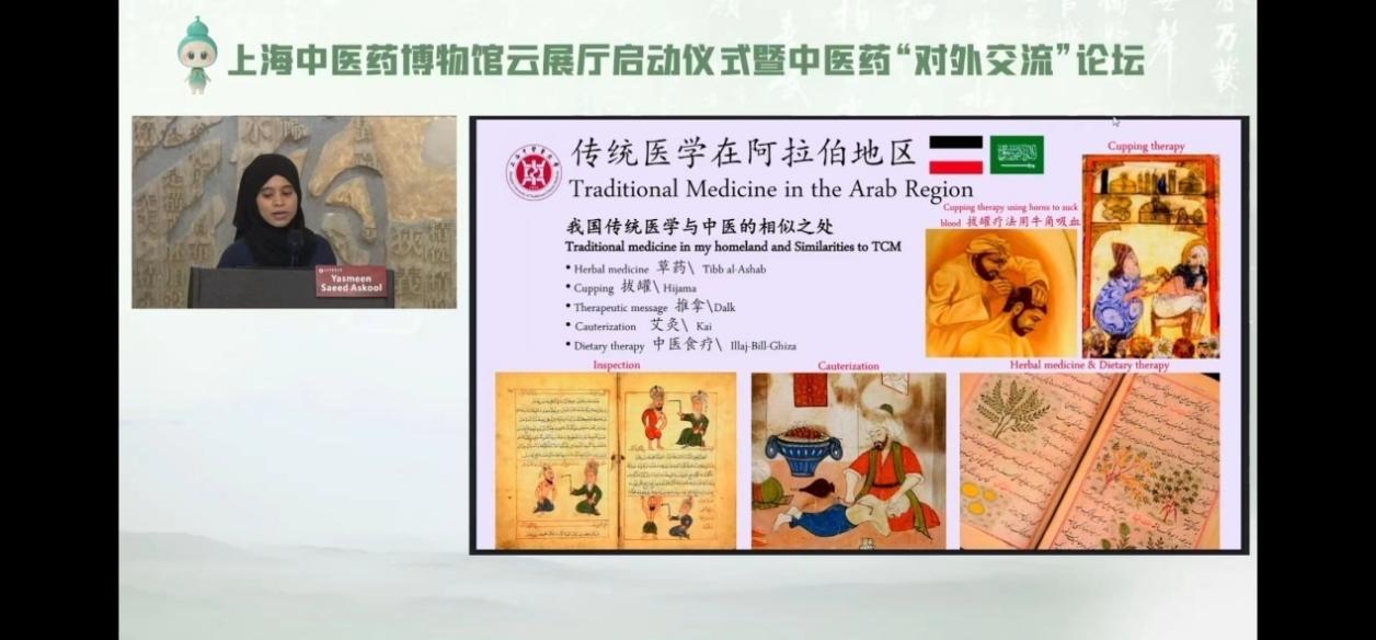 仪式后,中医药“对外交流”论坛举办。本次论坛邀请了3位来自世界各地的中医药学者进行主题交流。活动现场,来自也门的Yasmeen Saeed Askool(中文名为茉莉)作主题为Traditional Medicinein the Arab Region(“传统医学在阿拉伯地区”)的分享。