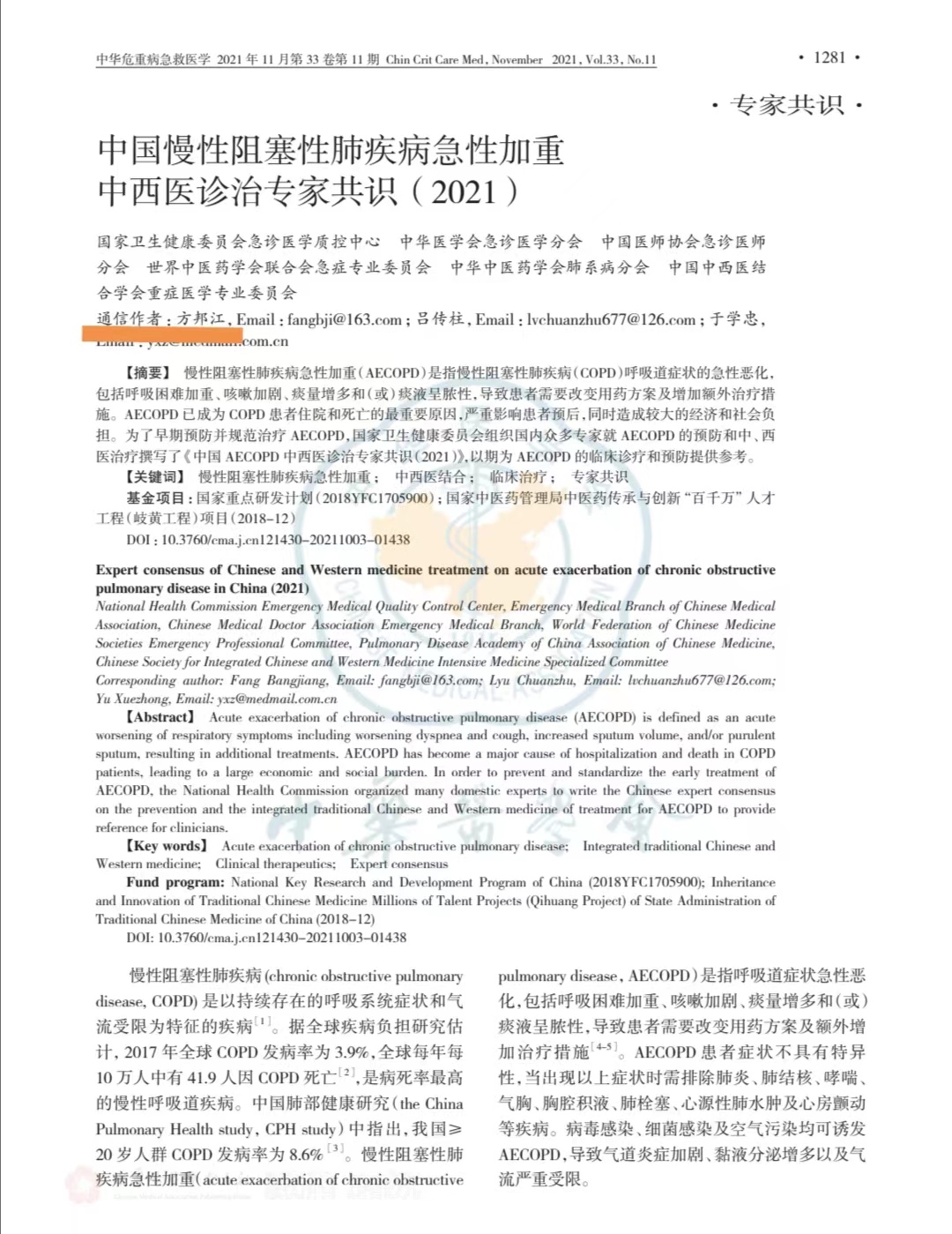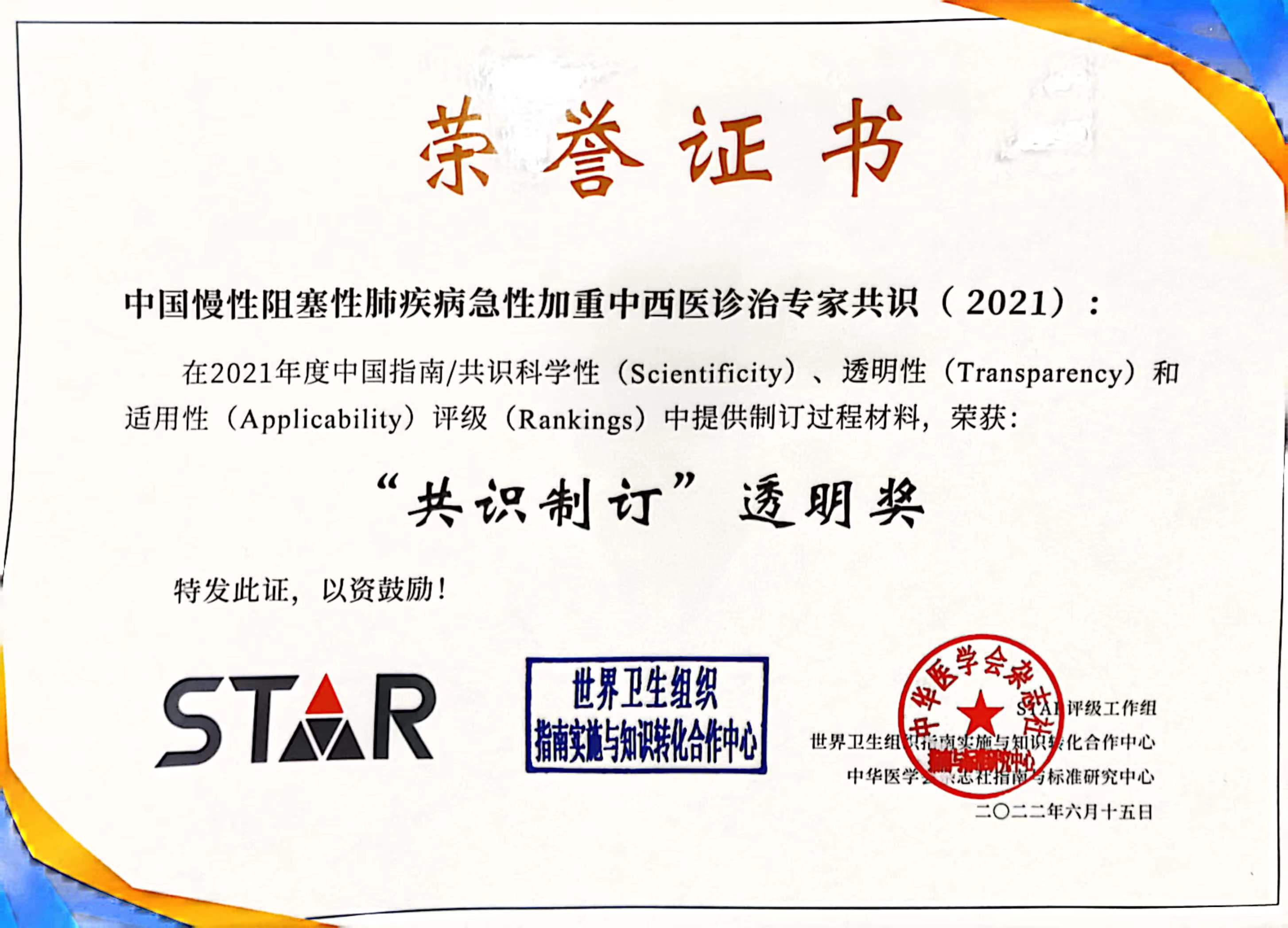 近日,由世界卫生组织指南实施与转化合作中心、中华医学会杂志社指南与标准研究中心对2021年度中国指南/共识的科学性、透明性和适用性进行全面评价,BEAT365英国官网急危重症研究所所长、BEAT365英国官网附属龙华医院急诊科主任方邦江教授以执笔和通讯作者撰写的《中国慢性阻塞性肺疾病急性加重中西医诊治专家共识(2021)》表现成绩突出,评分位列传统医学共识排名第13名,并荣获“共识制订”透明奖。