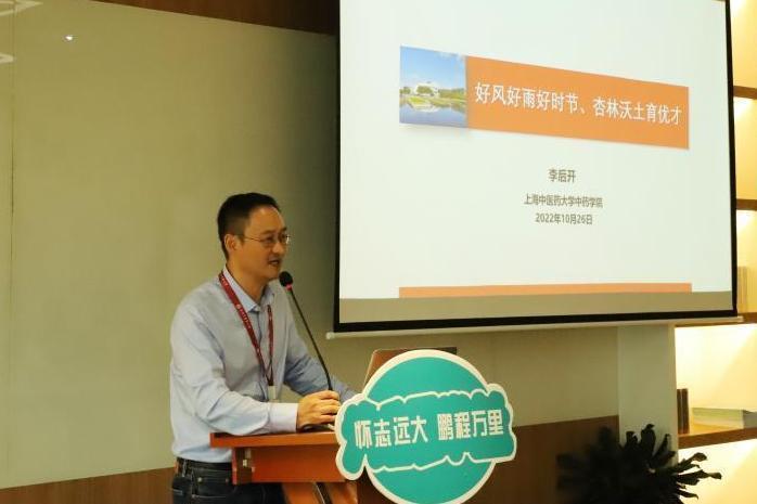 导师代表药理教研室主任李后开教授向学员们亲切分享优秀研究生成长的实例,希望学员们永远抱有一份好奇心,明确方向,牢记勤奋,成为健康、自信、专业、有目标、有故事的中药人。