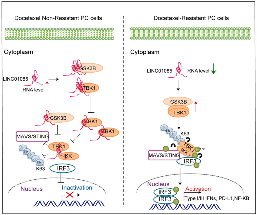 2022年10月,该团队联合上海大学李哲教授团队在Cancer Letters发表题为Docetaxel resistance-derived LINC01085 contributes to the immunotherapy of hormone-independent prostate cancer by activating the STING/MAVS signaling pathway的研究论文。多西紫杉醇的继发性耐药是侵袭性激素依赖性前列腺癌(HIPC)患者预后不良的主要原因之一。本研究通过多种药物相关的数据库和HIPC患者样本的RNA 测序数据相结合,筛选出紫杉醇耐药相关的长链非编码 RNA LINC01085。研究发现LINC01085的表达水平可指示紫杉醇耐药的HIPC患者的预后,作为潜在肿瘤抑制因子发挥功能。在多西紫杉醇敏感细胞中,LINC01085可同时特异性结合TANK-binding kinase 1 (TBK1)和糖原合成酶激酶3β (GSK3β),抑制TBK1二聚体的形成;而在紫杉醇耐药的细胞中,LINC01085 RNA表达水平降低,低表达的LINC01085 RNA失去了与两者的结合,TBK1与GSK3β之间的相互作用增强,加速TBK1 Ser-172位点的磷酸化,导致PD-L1、NF-κB和I/III型干扰素分泌表达水平升高。因此,LINC01085过表达联合免疫检查点阻断可能是治疗HIPC患者的有效策略。
