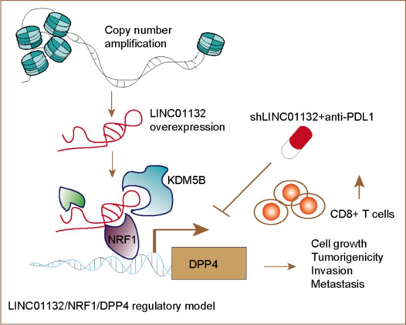2022年9月,该团队联合海南医学院李永生教授团队在Journal of Experimental & Clinical Cancer Research发表题为Long noncoding RNA LINC01132 enhances immunosuppression and therapy resistance via NRF1/DPP4 axis in hepatocellular carcinoma的研究论文,通过对lncRNAs全基因组表达模式的系统研究,发现LINC01132是肝细胞肝癌(HCC)中潜在的致癌基因,其在HCC中表达显著上调,与HCC患者的总生存率差相关。经研究发现,LINC01132可以与NRF1相互结合,同时增强DPP4的表达,发挥致癌的作用。值得注意的是,敲除LINC01132可诱导CD8+ T细胞浸润,敲除LINC01132联合PD-L1抗体治疗可提高PD-L1抗体对HCC敏感性,从而为肝癌联合治疗提供了新的策略。