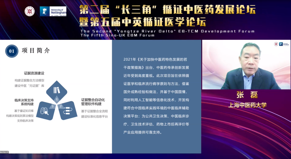 张磊教授介绍中医药证据整合一体化平台,该项目针对二次研究、证据整合、辅助决策等内容设计了中医药证据整合一体化平台。