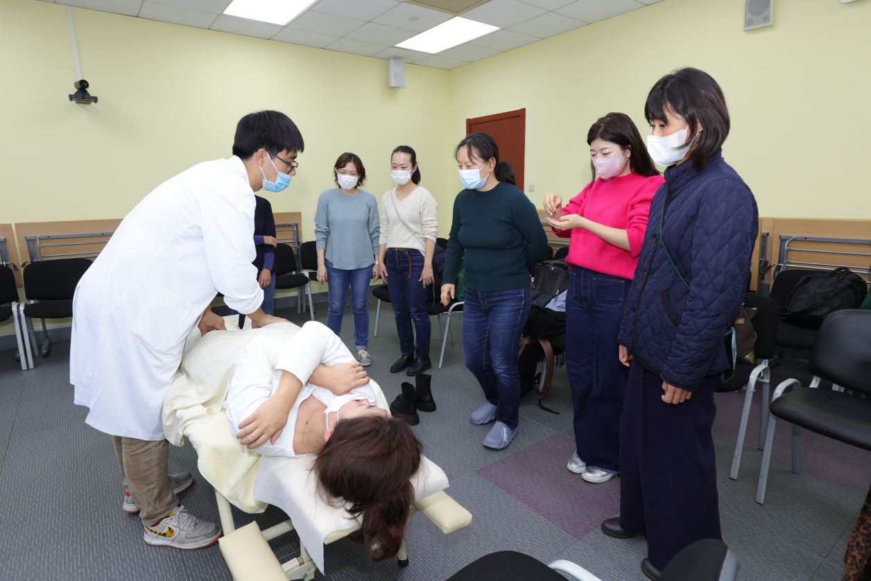在现场体验专区,校针灸推拿学院的专业教师对中医推拿手法、针灸穴位等知识进行了基本介绍,并邀请参与者现场体验。