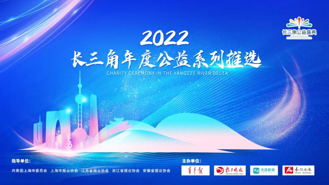 为了进一步弘扬现代公益精神,繁荣长三角公益事业,2022长三角年度公益系列推选活动于2022年10月启动,由共青团上海市委员会、上海市报业协会、江苏省报业协会、浙江省报业协会、安徽省报业协会指导,青年报、扬子晚报、天目新闻客户端、合肥晚报联合主办,旨在挖掘长三角公益范本,讲好长三角公益故事,弘扬长三角公益精神。