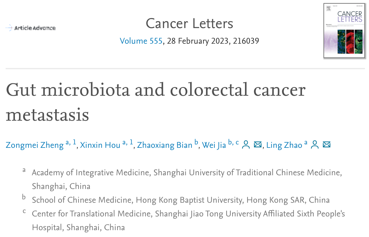 近日,中西医结合研究院赵玲团队和香港浸会大学贾伟、卞兆祥教授在Cancer letters合作发表题为Gut microbiota and colorectal cancer metastasis的综述文章。文章总结了肠道菌群在大肠癌转移过程的作用及分子机制,为靶向肠道菌防治大肠癌转移提供理论基础。