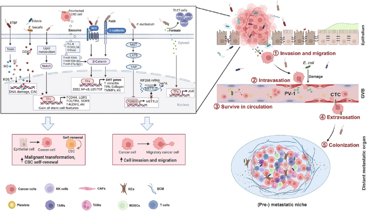 文章指出,肠道菌群可通过多种途径影响大肠癌远处转移,主要包括三个环节:一是增强肿瘤细胞恶性程度,即致病菌通过释放炎症因子促进肿瘤细胞恶变及增强肿瘤细胞自我更新能力;二是促进肿瘤细胞侵袭及迁移能力,即致病细菌通过分泌黏附素、毒素、外泌体物质等引起肿瘤上皮-间质转变、诱导DNA损伤以及增强肿瘤细胞播散能力;三是重塑肿瘤微环境,即紊乱的肠道菌群可调节远端器官中免疫细胞及基质细胞,塑造有利于肿瘤细胞定植的微环境,从而促进大肠癌转移。