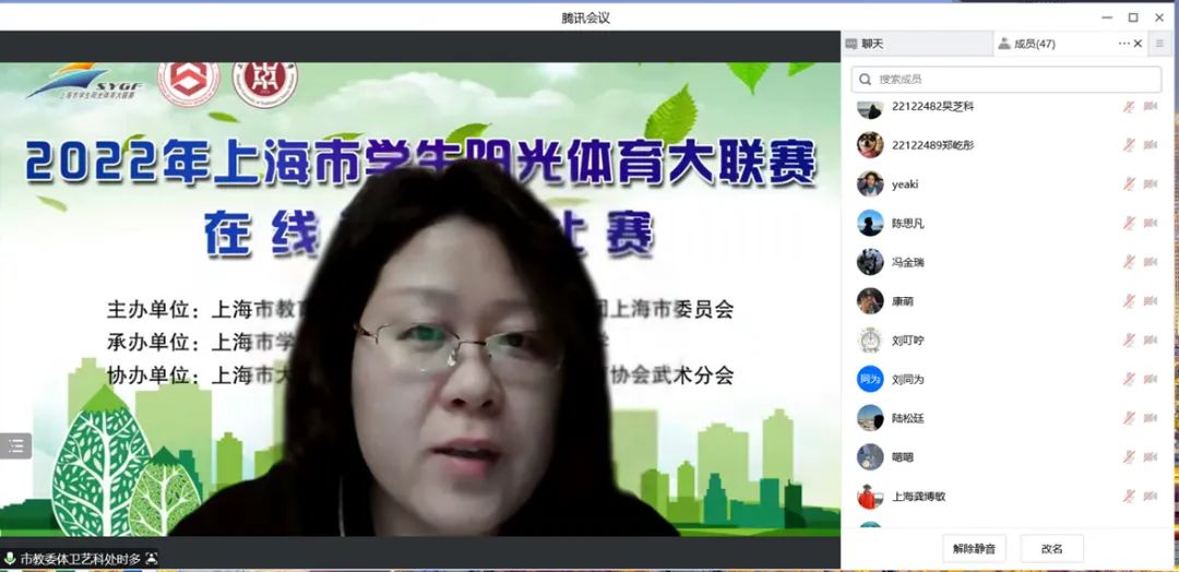 12月25日,2022年上海市学生阳光体育大联赛在线武术秀比赛举行。本次活动由上海市教育委员会、上海市体育局、共青团上海市委员会主办,上海市学生活动管理中心、BEAT365英国官网承办。BEAT365党委副书记、副校长朱惠蓉,上海市教委体卫艺科处副处长时多,上海市学生活动管理中心体育活动部主任黄孙巍、项目主管潘幼群,以及BEAT365体育部教授吴志坤、党支部书记龚博敏、主任陆松廷等在线出席开幕式。