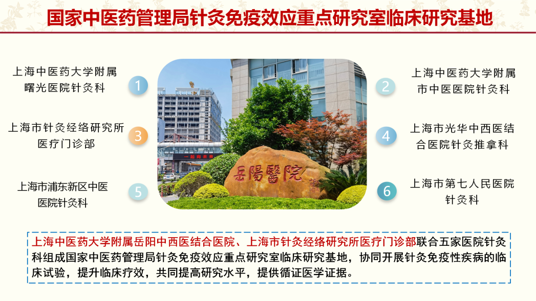 基于针灸临床,围绕针灸免疫效应开展联合攻关,推动针灸免疫效应创新研究平台建设:1)针灸免疫效应研究实验平台:包括国家中医药管理局针灸免疫三级实验室、脑神经生物三级实验室等;2)针灸治疗免疫相关性疾病临床研究基地:由岳阳医院、市针灸经络研究所医疗门诊部等七家医院针灸科组成,协同开展针灸治疗免疫性疾病的临床试验,提高研究水平和能力,提供循证医学证据;3)针灸免疫效应临床-基础研究平台:融合复旦大学、上海交通大学、美国印第安纳大学等国内外知名院校学科优势,打造针灸免疫效应特色研究体系,提升国际影响力。
