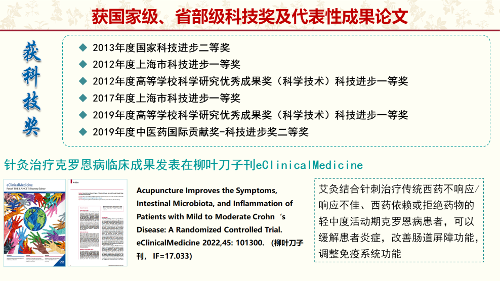 建设以来,牵头完成国家973计划针灸项目2项,均验收优秀,在全国18个省市推广应用。主持承担国家自然科学基金面上和青年基金项目40项,省部局级项目45项,并在三个研究方向上取得了重要进展和成果,获国家科技进步奖二等奖1项,上海市科技进步奖一等奖2项、国家教育部科技进步奖一等奖2项;在柳叶刀子刊eClinicalMedicine和JAMA Network Open、中国针灸等杂志发表学术论文300余篇,获授权专利40余项,其中发明专利7项,实现成果转化1项,形成针灸团体标准1项,2012年验收优秀,2021年阶段性评估优秀。重点研究室主任吴焕淦教授,入选爱思唯尔2020年中国高被引学者榜单,2022年10月入选全球前2%顶尖科学家榜单。