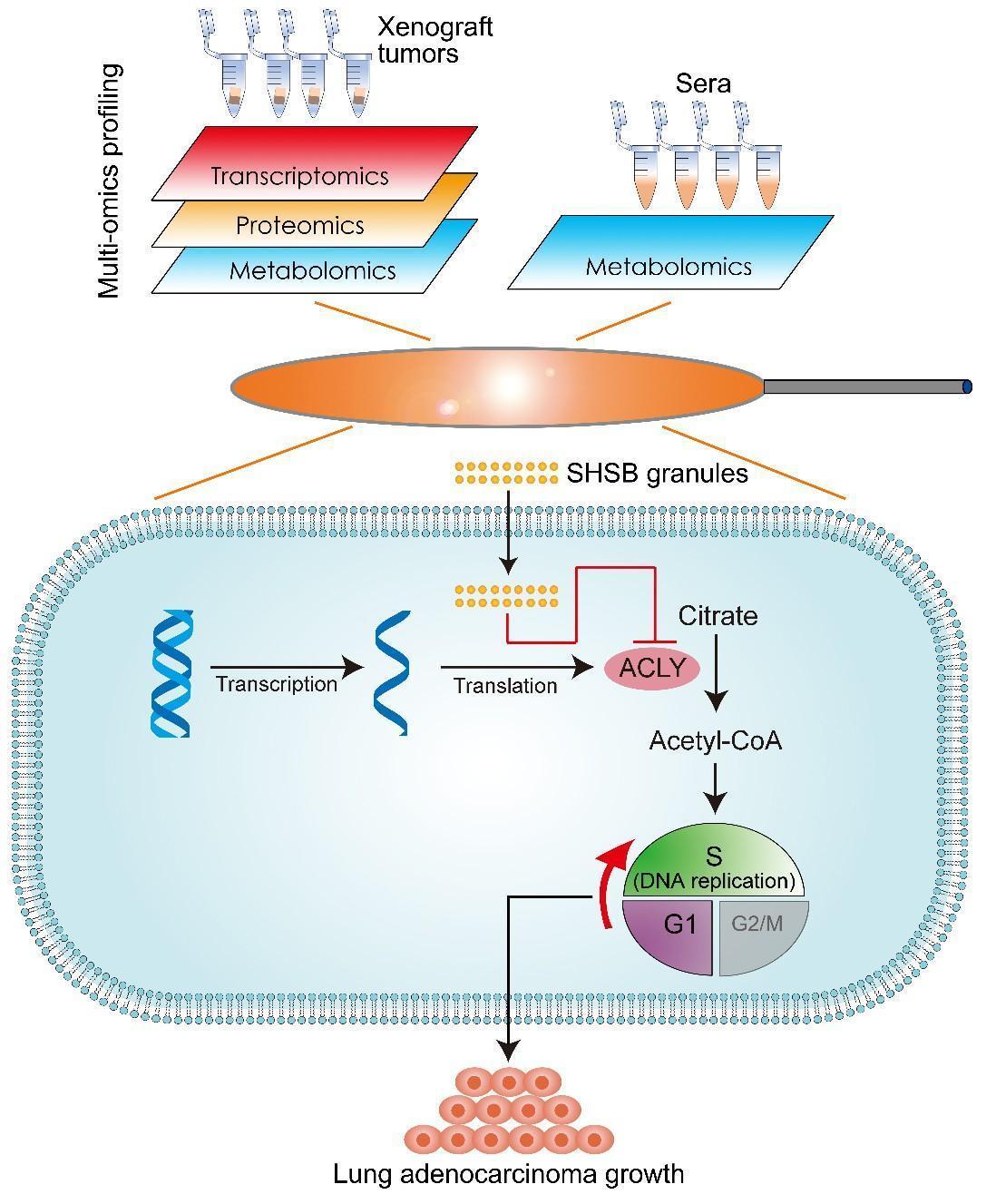 该研究利用不同的小鼠模型,证实双黄升白颗粒口服给药可明显抑制皮下移植瘤和肺部转移瘤的恶性生长,同时可显著延长晚期转移模型小鼠的总生存期。通过对移植瘤标本开展转录组、蛋白质组和代谢组分析,以及对血清标本开展代谢组分析,揭示了双黄升白颗粒抗肿瘤的新机制:通过转录后调控的方式,下调肿瘤内关键代谢酶ATP柠檬酸裂合酶ACLY的蛋白表达,进而抑制促癌代谢物乙酰辅酶A在瘤内的合成以及向外周血的释放,最后遏制肿瘤恶性生长。研究开展了小样本临床试验,发现双黄升白颗粒口服给药同样能显著下调肺癌患者外周血中的促癌代谢物乙酰辅酶A水平。研究还开展了临床相关性检测分析,发现双黄升白颗粒的作用靶点ACLY及其介导的乙酰辅酶A合成通路在肺腺癌患者的癌组织中被异常活化,并发现肿瘤内ACLY的高表达指征患者预后不良。研究通过生物学实验揭示了双黄升白颗粒的作用靶点ACLY的促癌功能,揭示该代谢酶靶点通过促进细胞的DNA合成和细胞周期进展,进而促进肺癌细胞的恶性增殖。