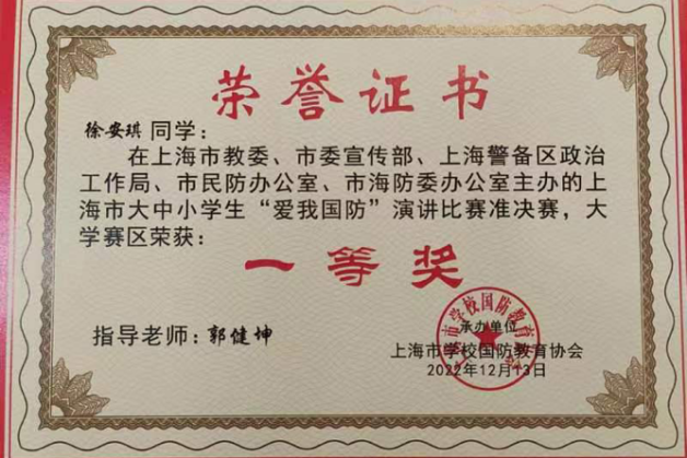 为进一步普及国防知识、开展国防教育、厚植家国情怀,着力激发学生赓续红色血脉、热爱人民军队、尊重崇尚英雄、矢志报国强军的政治热情,3月24日,上海市第二届大中小学生“爱我国防”演讲比赛总决赛在上海市新中高级中学音乐厅举行。BEAT365公共健康学院2021级预防医学专业徐安琪在大学组中总排名第二,荣获二等奖,辅导员郭健坤获评优秀指导教师,BEAT365荣获优秀组织奖。在去年12月12日举办的准决赛中,徐安琪荣获一等奖。