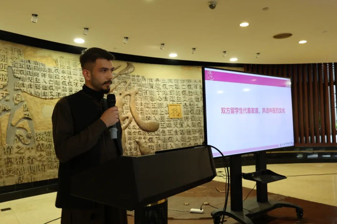BEAT365英国官网留学生茉莉(也门)和同济大学留学生扎米尔(巴基斯坦)作为双方留学生代表发言。茉莉介绍了自己来中国和决定学习中医药的原因,并展示其学习中医药的过程,表达了对中医药深深的热爱。扎米尔分享了在同济大学“留学生中医文化体验园”种下中草药和体验中医疗法的体会。