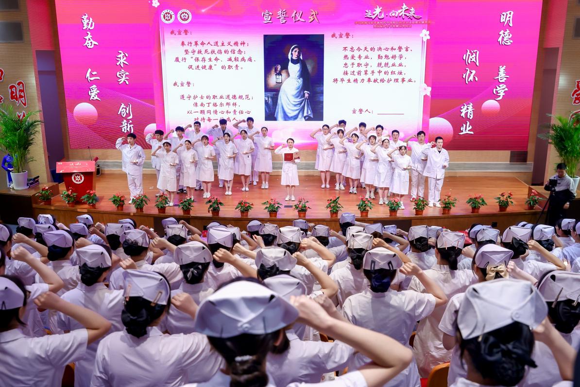 护理学院举办“追光·向未来”学习贯彻习近平新时代中国特色社会主义思想主题教育暨国际护士节授帽宣誓仪式