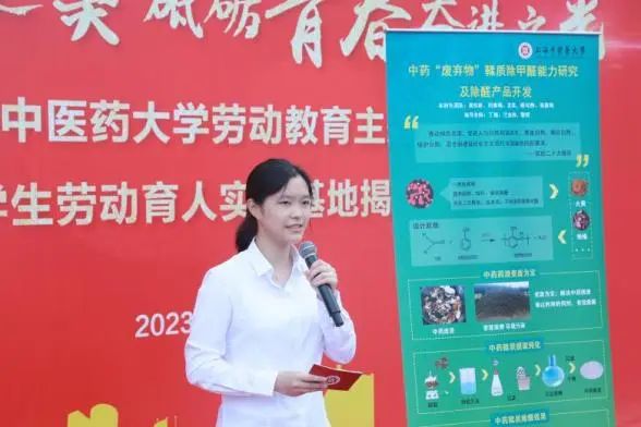 朱惠蓉与陈翔共同为“大学生劳动育人实践基地”揭牌。今后,基地将积极发挥中医药文化在大学生劳动教育中的特色,利用各类资源为劳动教育提供必要保障。