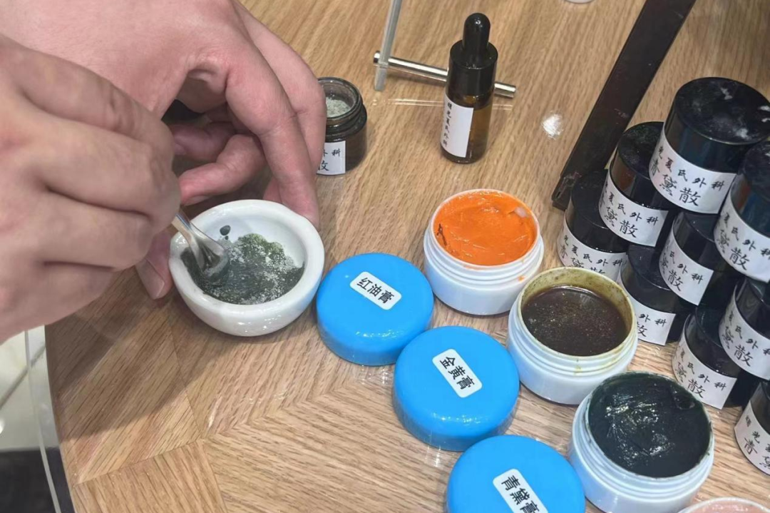 本届进博会,夏氏外科展出了剂型丰富、疗效显著的传统特色制剂。口服制剂有清热解毒的“蒲丁合剂”、主治甲状腺结节的“消瘿合剂”等;外用药有治疗疮疡的“金黄膏”、收湿止痒的“青黛膏”等。