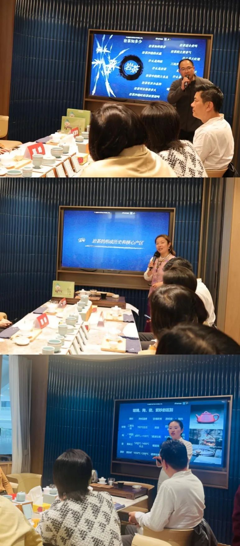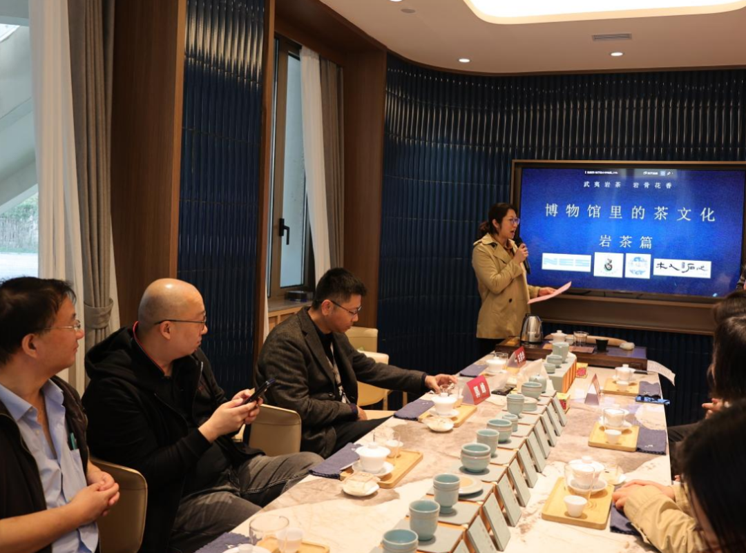 上海中医药博物馆高级艺术品鉴定师张奕雄、上海万客居茶文化有限公司CEO孙煜和上海宁蔓文化传播有限公司CEO、传福德品牌创始人夏宁蔓为本次活动主讲人。孙煜简要介绍讲岩茶的形成历史和核心产区的相关知识。张奕雄与茶友进行岩茶健康知识互动交流,回答现场茶友在品鉴岩茶中的一些疑问,并讲解紫砂壶、瓷器等鉴赏方法。夏宁蔓带领茶友品茶赏瓷,畅谈岩茶给人的诸多美好印象,展示龙泉青瓷之美,并传授盖碗泡茶知识和注意事项。