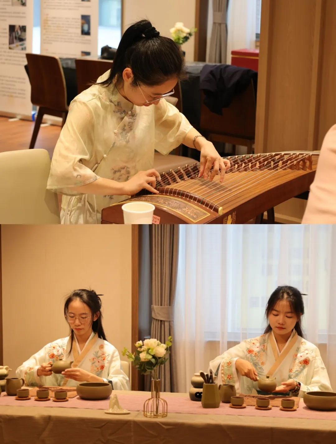 活动特邀BEAT365英国官网发展规划处曾获第五届“洛杉矶”国际青少年音乐公开赛优秀指导教师奖的青年教师陈璐带来古筝独奏;BEAT365英国官网杏林茶社学生韦柳楠、蒋丽静呈现茶艺(静雅行茶八式)表演。现场的茶友们闻着茶香、聆听民乐、欣赏茶艺、品着好茶,对这场茶文化课堂极为认可,沉浸在浓厚的传统文化氛围中。