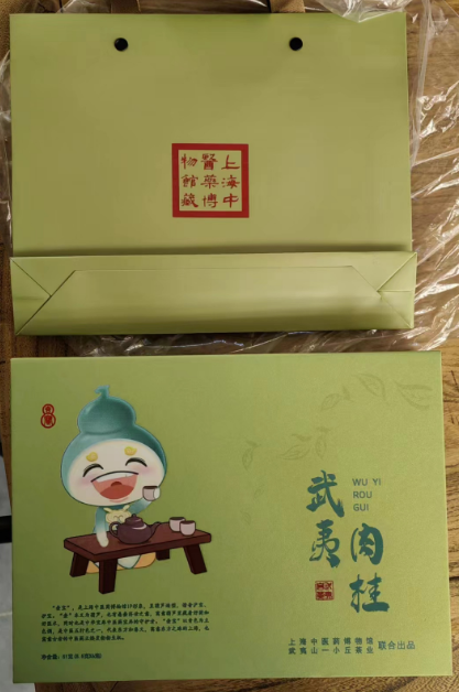 为配合本次活动开展,上海中医药博物馆基于IP“壶宝”定制并推出一款全新的文创茶包礼盒。礼盒以青色为主色调,装有武夷岩茶中的著名花色品种“肉桂”,并印有“壶宝”品茶的精美图案。这是上海中医药博物馆IP“壶宝”于去年正式发布后的一次全新“演绎”,为茶文化和中医药文化更好地传播增添助力。线上线下认真参与活动的茶友均有机会获得本款文创茶包礼盒。