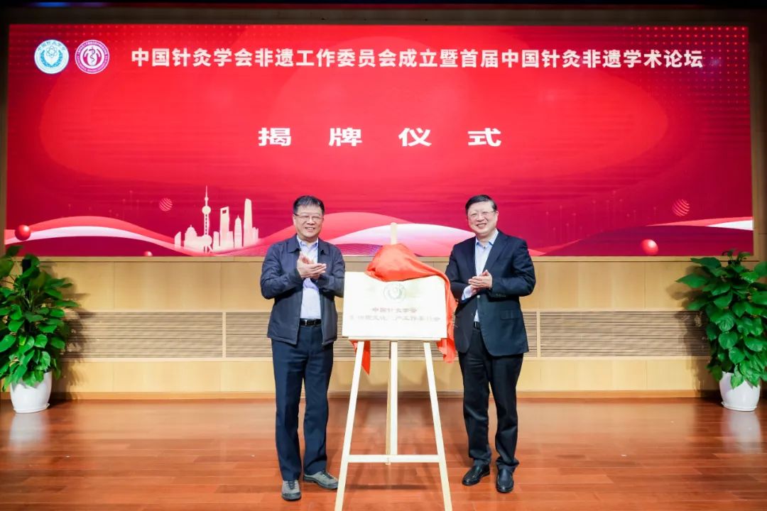 喻晓春和岳阳中西医结合医院院长周嘉共同为中国针灸学会非物质文化遗产工作委员会揭牌。