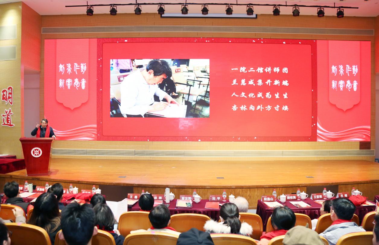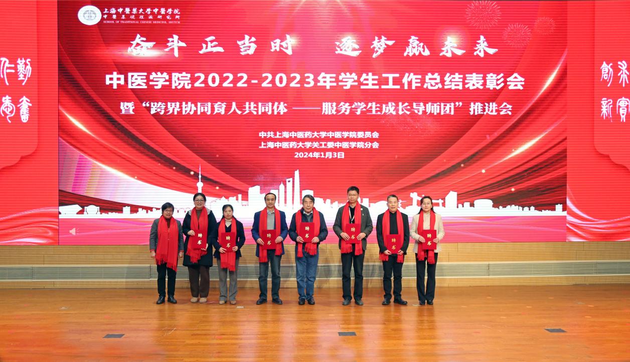 新年伊始,中医学院以一场接地气、聚人气、冒热气的学生工作大会谋新篇、开新局、聚新力。1月3日,中医学院2022-2023年学生工作总结表彰会暨“跨界协同育人共同体——服务学生成长导师团”推进会在图书馆裙楼四楼报告厅举行。学校“生生”导师团团长、终身教授段逸山,杏林春华导师团团长、终身教授刘平,仁术合一导师团团长、退休党委副书记顾攸美受邀出席大会。学校相关职能部门,图书馆、上海中医药博物馆、体育部等党建共建单位,上海市档案馆、陈云纪念馆等合作单位的相关同志,青年教师班主任、辅导员、家长代表、全体在校生参加会议。中医学院党委副书记陆佩丽主持会议。