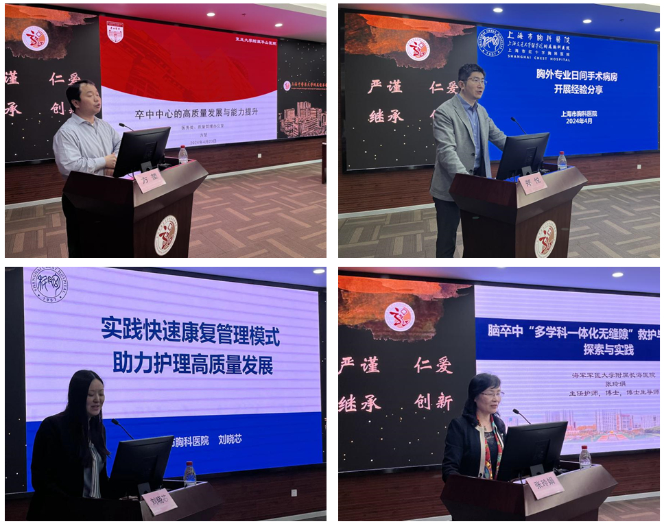 方堃、郑悦分别作“卒中中心的高质量发展与能力提升”“胸外专业日间手术病房开展”授课,就华山医院有效组织化管理卒中治疗、卒中高质量发展展望和胸科医院日间手术的发展历程、组织运行管理的实践经验进行详尽介绍。刘晓芯、张玲娟分别作“实践快速康复管理模式,助力护理高质量发展”“脑卒中‘多学科一体化无缝隙’救护与康复模式的探索与实践”分享,介绍了胸科医院围手术期ERAS护理管理核心举措及长海医院脑卒中多学科一体化无缝隙救护模式、康复模式的宝贵经验。